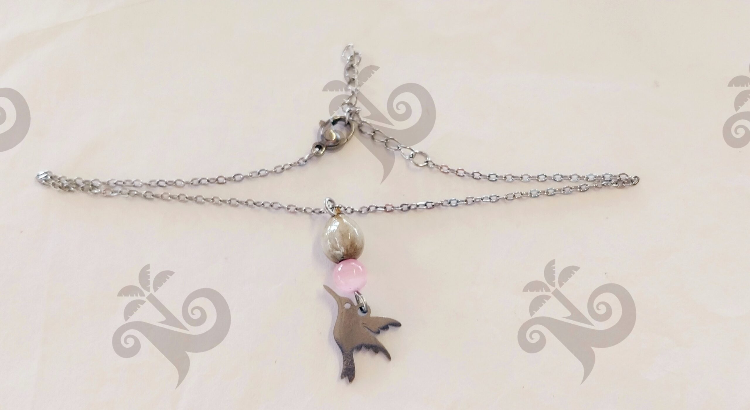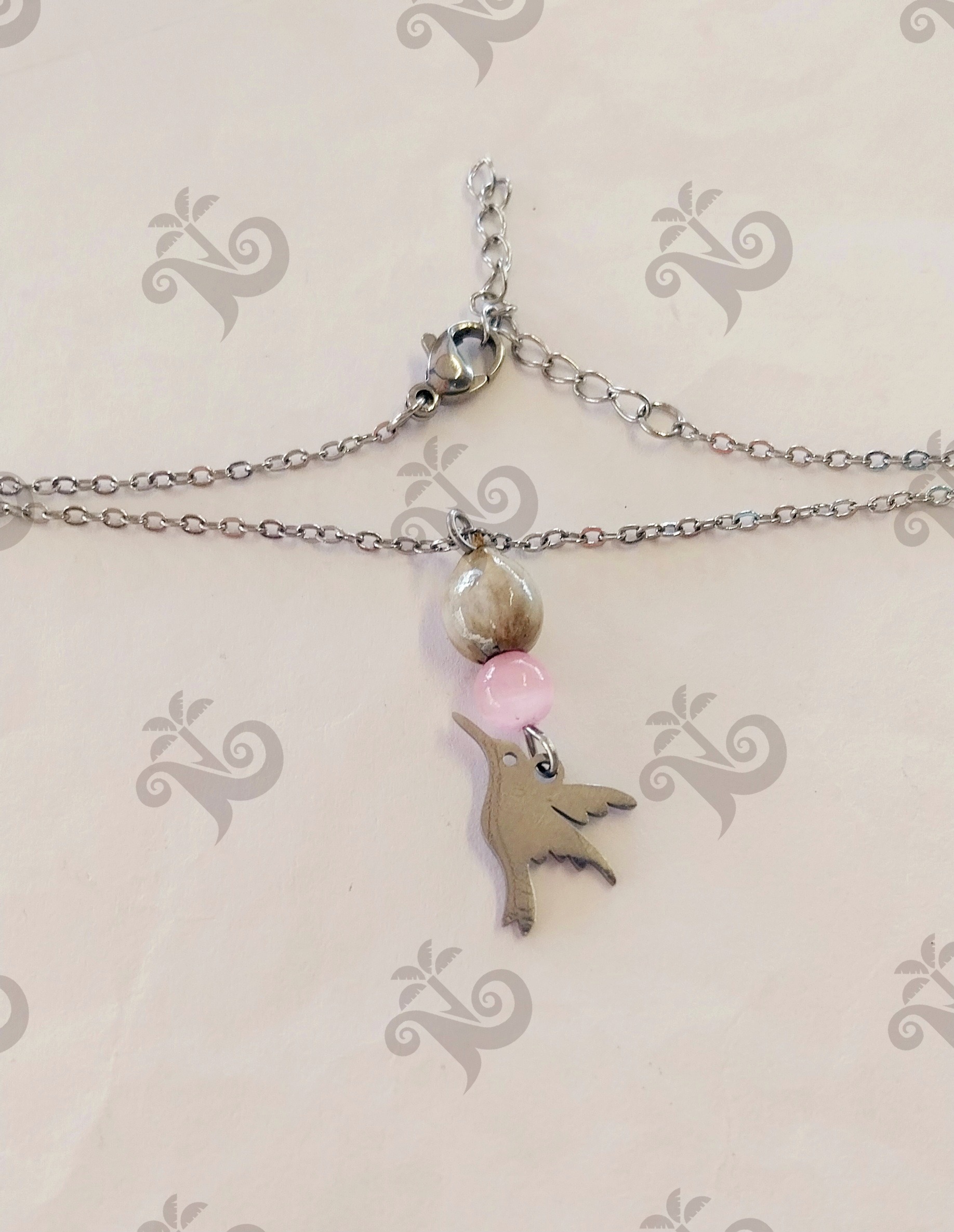 Chevillère avec un petit colibri dessiné et fait main en acier chirurgical avec la graine naturelle larme de job qui a diverses vertus et la pierre l'œil de chat rose.